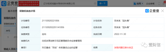 据企查查,在2020年11月进行的“双体系‘回头看’”双随机抽查中,在“对已建成‘双控’体系建设企业的监管”检查结果显示拓邦鸿基“发现问题已责令改正”。