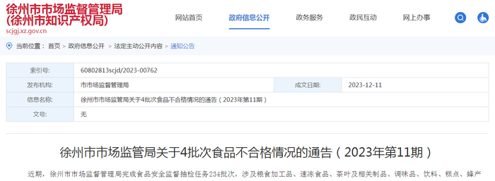 徐州市市场监管局关于4批次食品不合格情况的通告(2023年第11期)
