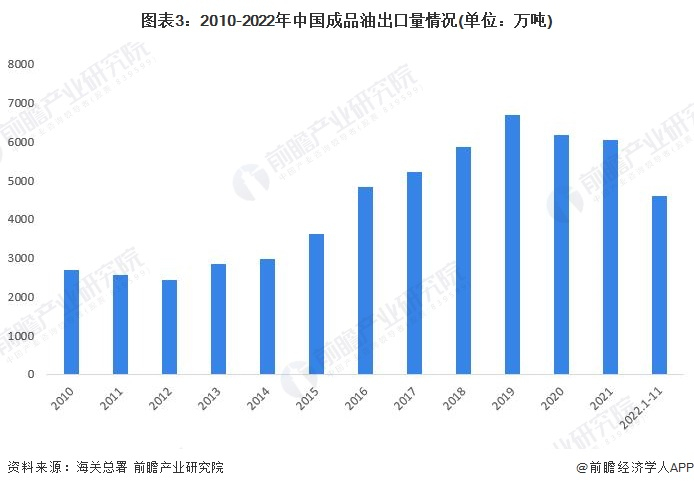 2010-2019年,中国成品油出口量整体呈波动上升趋势。2019年,中国全年成品油出口量达到6685万吨,同比增长了14%。然而,2020年全球疫情爆发导致国外成品油消费市场受到冲击,中国全年出口成品油量为6183万吨,较2019年下降了7.5%。随后,2021年全球大宗商品价格上涨,原油价格也攀升至高点,中国成品油累计出口量达到6031万吨,累计下降2.4%。到2022年11月,中国成品油累计出口量达到4608万吨,同比下降19.40%。