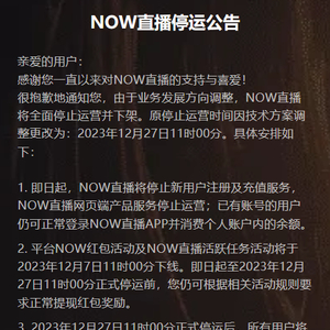根据“NOW直播停运公告”,12月5日起,NOW直播停止新用户注册、网页端停止运营,12月11日平台NOW红包活动及NOW直播活跃任务活动下线,12月26日用户将无法继续使用NOW直播产品服务等。针对用户账户内余额,腾讯提供资产迁移方案或退款方案。