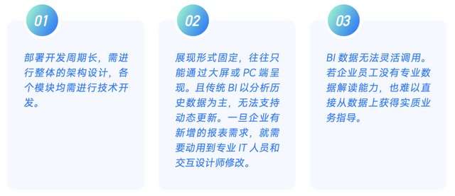 1)在数据分析场景中,各生产车间的产能数据都会存储进数据库,形成 BI 数据看板,以便让企业与工厂管理者了解每日产能情况,及时发现并解决问题。不过,传统的数据看板往往存在如下三大限制: