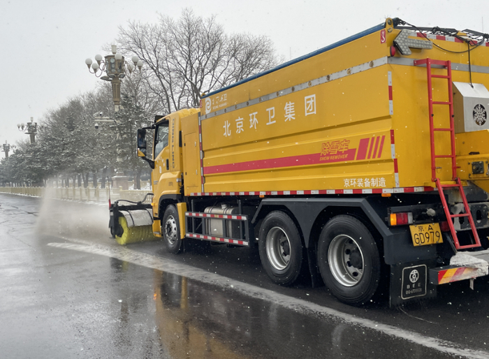 此外,在非机动车道、人行便道等地,还有人工推雪机、滑移机等设备,可以迅速扫除积雪。今年冬天,北京环卫集团所有作业车辆还均安装了北斗系统,可利用监控信息功能对作业点位、作业轨迹进行监控,实现扫雪铲冰作业的实时化、可视化。新配备的电动多功能洗扫车辆设计小巧,可满足狭小路况、桥洞、涵洞、人行横道、小区、公园绿地和广场的道路清扫、清洗和道路积雪的清理清扫功能,整车匹配12兆帕高压水泵,可对路面沉积物进行高效清洗清理。