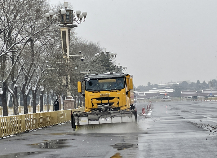 除了应用于环路主辅路、城区主干道等地的多功能除雪车,其他区域也有许多除雪“利器”助力扫雪铲冰。天安门广场地区,北京环卫集团机扫公司天安门环境服务中心的环卫职工们使用抛雪机、扫雪机、吹雪机、小型多功能扫雪车、山猫除雪车等多种设备作业,忙得热火朝天。广场区域不能使用大型机械作业车辆,人工清扫的效率又太慢,山猫除雪车这种中小型设备用起来正合适。只有电脑包大小的吹雪机带有一个黑色风筒,可以把缝隙里的积雪打散吹到四周,用来清除广场上旗杆底座、台阶边缝这些犄角旮旯里的积雪正好。