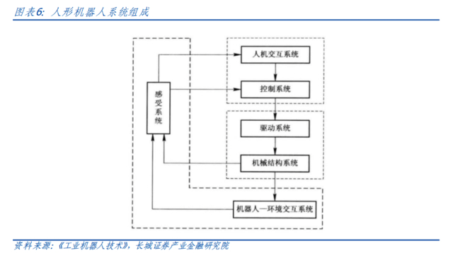 从供给视角,长城证券认为,人形机器人集成度高,涉及多种前沿技术。具体来说,人形机器人可以分为3大部分6个子系统,3大部分是机械部分、传感部分和控制部分;6个子系统是驱动系统、机械结构系统、感受系统、机器人-环境交互系统、人机交互系统和控制系统: