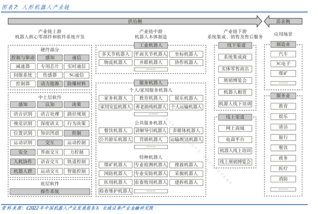 长城证券指出,因产业链庞大,吸引众多资本入局加快产业发展。参考其他机器人,人形机器人产业链可分为上游零部件和软件系统开发、中游本体制造、下游系统集成和销售: