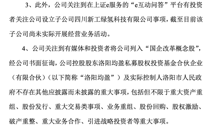 二是有媒体和投资者将公司列入“国企改革概念股”,经书面征询,公司控股股东洛阳均盈私募股权投资基金合伙企业(有限合伙)及实控人洛阳市政府不存在其他应披露而未披露的重大事项。