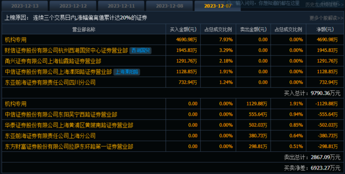 这已经是12月以来四川金顶第三次发布股价异动公告。从龙虎榜数据看,其连续涨停期间,南京证券桐乡庆丰北路证券营业部、“拉萨天团”、西湖国贸、上海溧阳路等知名游资榜上有名。