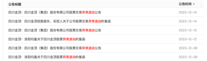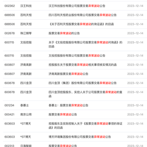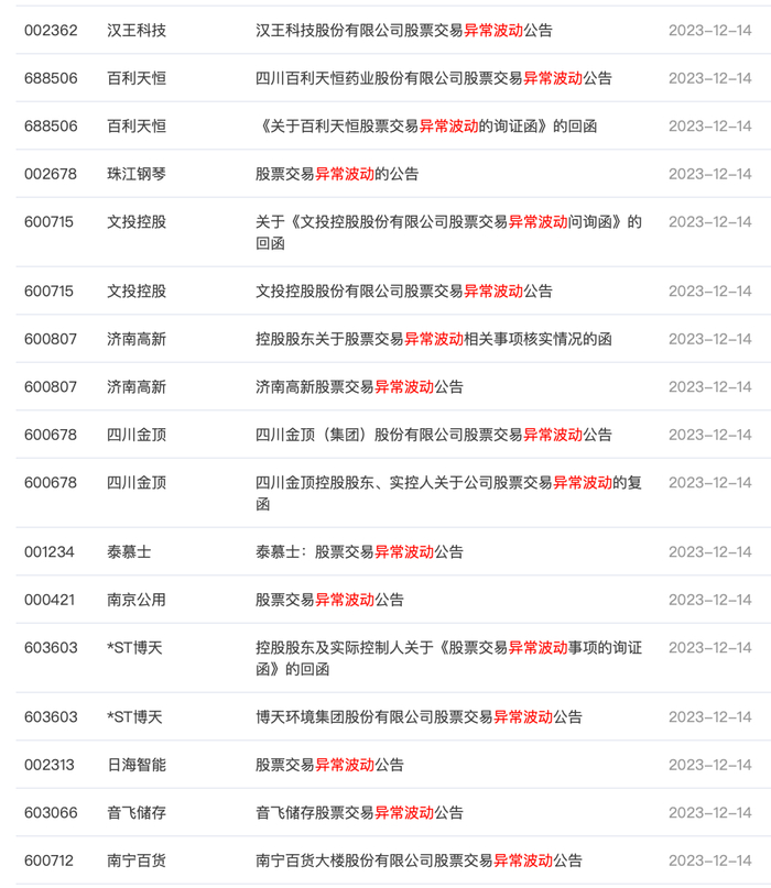 12月13日晚间,四川金顶、南京公用、济南高新、国新文化等一批公司发布股价异动公告。记者注意到,这些个股近期均出现明显上涨,其中四川金顶、文投控股更是斩获六连板。多家公司甚至火速澄清、一再提示风险,但市场热度依旧不减。