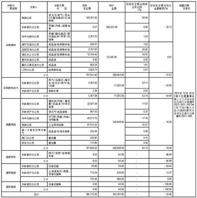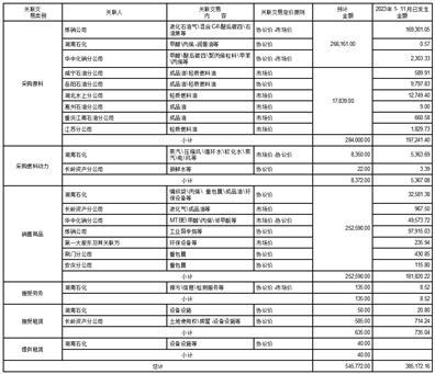 2023年1-11月,公司实际向第一大股东关联方采购原料197,241.40万元,采购燃料动力5,367.08万元,销售产品181,820.22万元,接受第一大股东关联方劳务服务8.52万元,接受第一大股东关联方租赁服务735.04万元,实际发生总额385,172.26万元;实际向兴长集团及其分子公司采购原料538.88万元,销售产品金额合计2,365.00万元,接受兴长集团及其分子公司提供劳务金额合计849.41万元,实际发生总额3,753.29万元。实际向岳阳长云采购燃料动力3,768.82万元,接收岳阳长云提供劳务81.89万元,实际发生总额3,850.71万元。