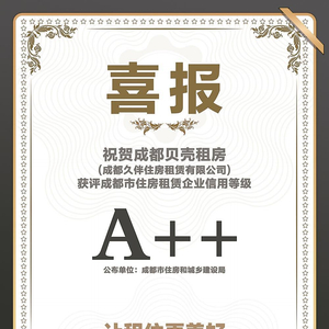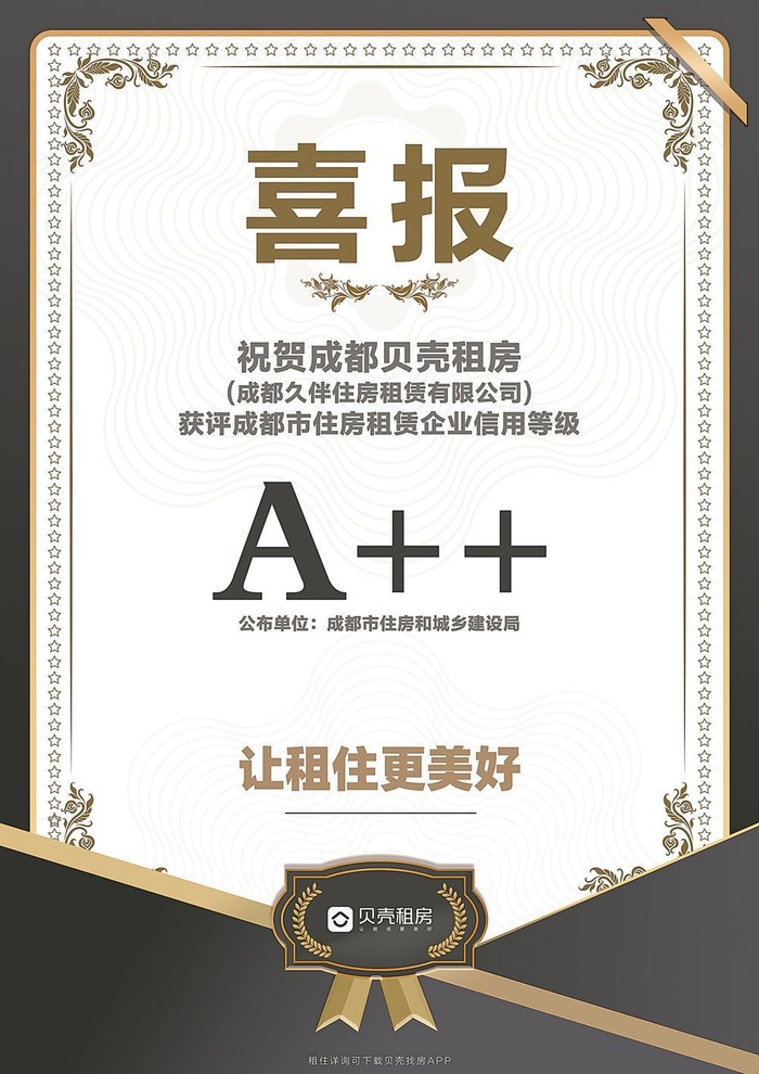 今年10月,成都贝壳租房(成都久伴住房租赁有限公司)在成都住建公布的企业信用分中有幸成为成都租赁行业的A++企业。这也是贝壳租房入蓉两年来取得的众多荣誉之一。