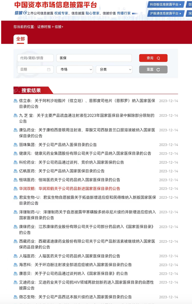12月13日,国家医保局、人力资源社会保障部印发《国家基本医疗保险、工伤保险和生育保险药品目录(2023年)》。当晚,逾20家A股上市公司集中披露产品被纳入国家医保目录的相关公告。
