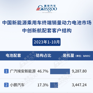 根据盖世 汽车 配置数据库统计,2023年1-10月 中创新航 在中 国 新能源 乘用车 终端销量 动力 电池 市场(不包含进口)中,结构占比最高的是广汽埃安新能源,为46.7%,装机量为9.3GWh。小鹏汽车则是以17.3%的占比与3.4GWh的装机量位居第二。而第3-10位则是 零跑汽车 、智马达、广汽新能源、 长安汽车 、深蓝汽车、合创汽车、蔚来汽车与 吉利汽车 。