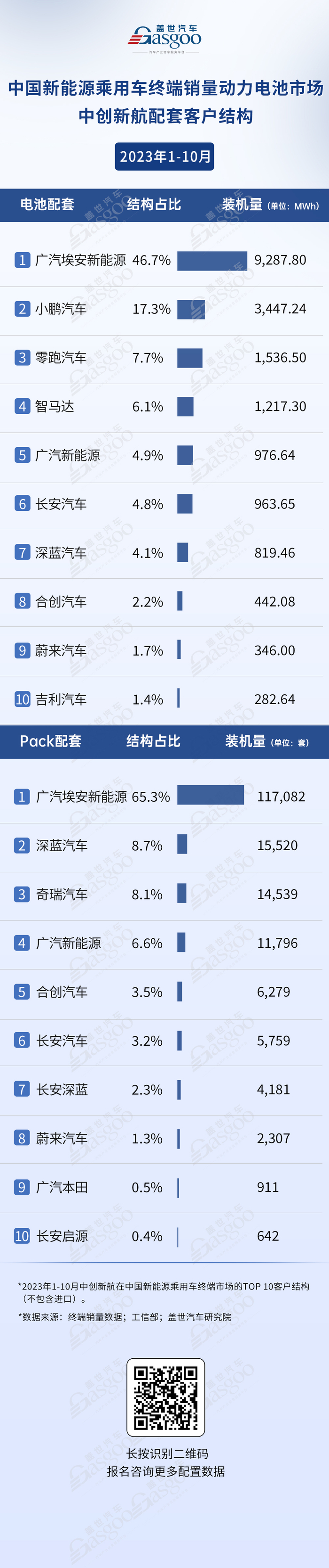 而Pack配套中,广汽埃安新能源以65.3%的占比与117,082套的装机量,位列第一。深蓝汽车则是排在第二,而第3-10位则是奇瑞汽车、广汽新能源等车企。