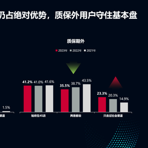 本年度报告加入新势力品牌分类,受此类品牌用户维保渠道选择影响,“始终在4S店”维保客户比例较去年略有上升,占比较2022年上升5.3个百分点;质保期外,坚持到4S店维保的用户与往年占比持平。