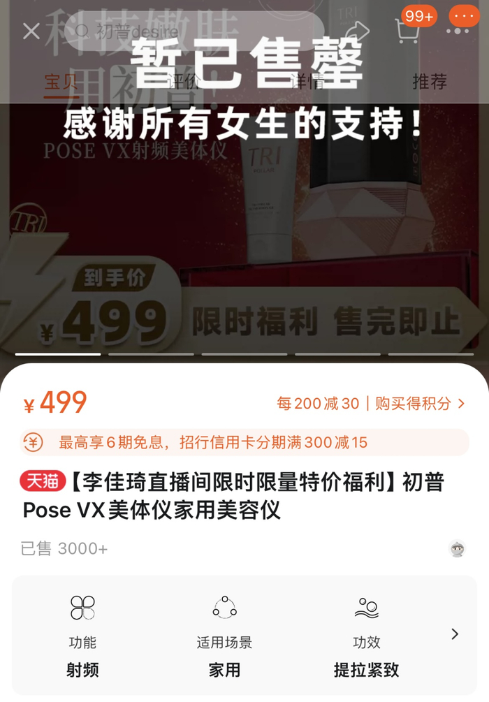 有消费者发现,在李佳琦直播间当天的货品清单中,以色列家用美容仪品牌Tripollar初普的两款美容仪“POSE VX射频美体仪”和“Desire欲望之能美容仪”上架,但令人惊讶的是,这两款产品标价仅499元,与其官方旗舰店的2199-3688元的正常售价相差了5-6倍以上。
