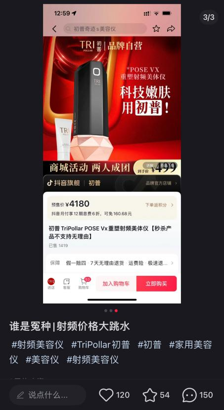 另有消费者发现,从在李佳琦直播间降价至499元后,Tripollar初普抖音旗舰店也在12月9日将一款热卖产品“奇迹S射频美容仪”(原价2599元)标出团购699元的低价。