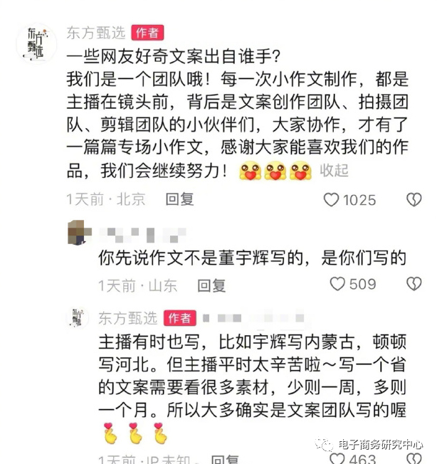 12月6日,东方甄选抖音号运营小编在宣传视频下方声称,“每一次小作文制作都是主播在镜头前,背后是文案创作团队、拍摄团队、剪辑团队的小伙伴们,大家协作,才有了一篇篇专场小作文。”针对网友的疑问,小编表示,主播有时也写,比如宇辉写内蒙古,顿顿写河北。但主播平时太辛苦,大多是文案团队在写。