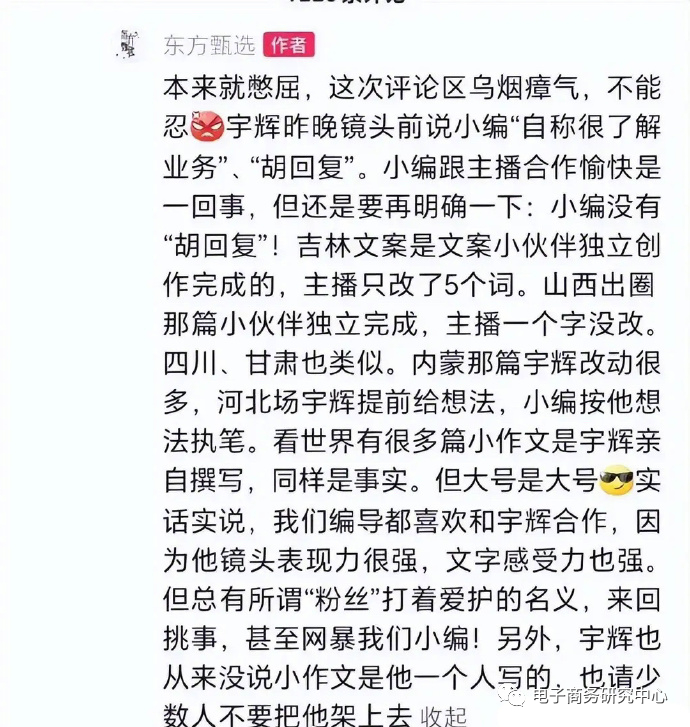没想到这句话再次引起争议。针对董宇辉的回应,东方甄选小编直接在评论区“手撕”:“本来就憋屈,这次评论区乌烟瘴气,不能忍宇辉昨晚镜头前说小编‘自称很了解业务’、‘胡回复’。小编没有‘胡回复’!”小编还列举每一场的小作文创作:吉林、山西、四川、甘肃场的文案均由文案团队独立创作完成;内蒙篇宇辉改动很多,河北场宇辉提前给想法,小编执笔;看世界有很多篇小作文是宇辉亲自撰写,同样是事实。随后,小编将矛头转向粉丝:“总有所谓‘粉丝’打着爱护的名义,来回挑事,甚至网暴我们小编!”