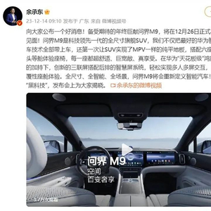 “向大家公布一个好消息!备受期待的年终巨献问界M9,将在12月26日正式与大家见面!”余承东说,问界M9是科技领先一代的全尺寸旗舰SUV,华为不仅把最好的华为智能汽车技术全部带上车,还第一次让SUV实现了MPV一样的纯平地板,搭配六座均权头等舱体验座椅,每一座都超舒适、巨宽敞、真享受。