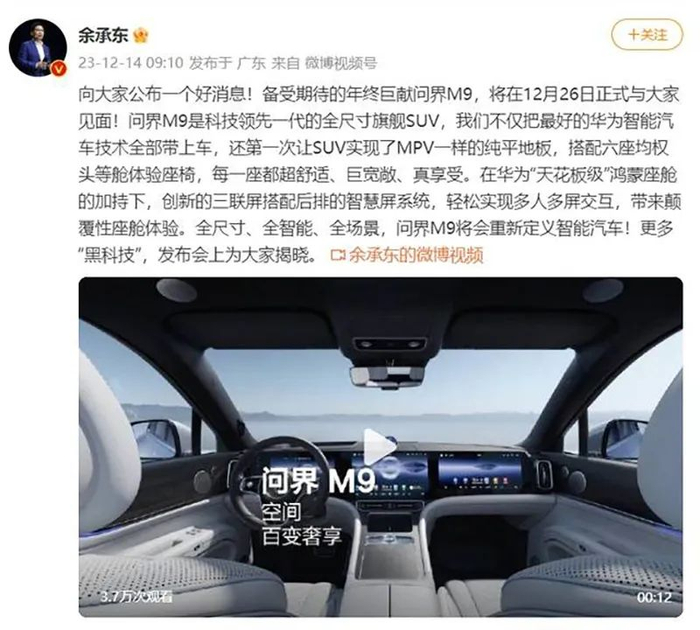 12月14日,华为常务董事、华为终端BG CEO、智能汽车解决方案BU董事长余承东通过其个人社交账户宣布,华为和赛力斯合作的问界M9新车将在2023年12月26日正式发布,新车搭配六座均权头等舱座椅以及三联屏等。