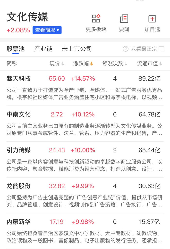 传媒娱乐板块反复活跃,引力传媒10天6板,龙韵股份4连板,内蒙新华、遥望科技涨停,此外紫天科技、中国出版、中信出版、新华文轩等个股涨幅居前。