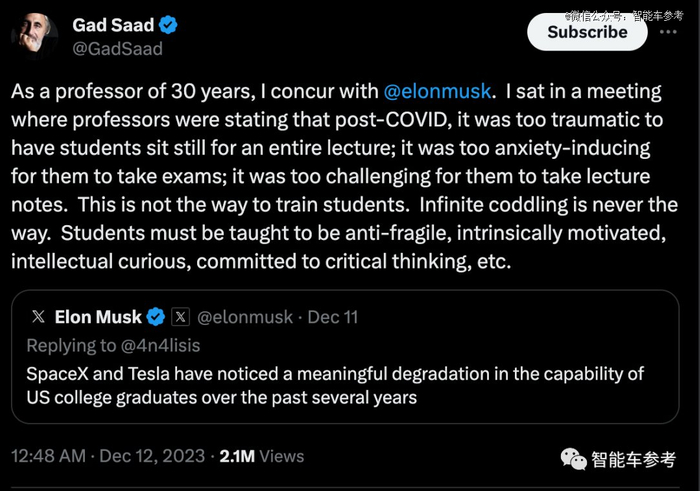 一位来自加拿大康考迪亚大学、拥有30年教龄的教授Gad Saad表示同意马斯克的观点。他评论道:
