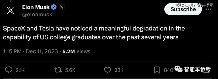 马斯克立刻表示赞同,回复道:“SpaceX和特斯拉都发现了,过去几年美国大学毕业生的能力明显下降。”