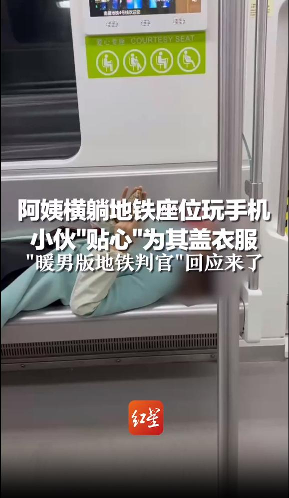 阿姨横躺地铁座位玩手机,小伙“贴心”为其盖衣服,“暖男版地铁判官”回应来了
