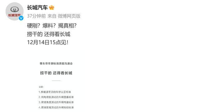 长城汽车官博称:硬刚?爆料?揭真相?捞干的,还得看长城,12月14日15点见!