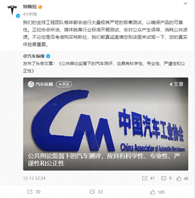 近日,懂车帝发布《2023懂车帝冬测》,在汽车行业引起轩然大波,在华为、长城汽车、吉利汽车对测试标准表示质疑后,12月14日,特斯拉回应:全球工程团队每年都会进行极寒测试,确保产品可靠性。