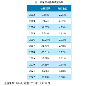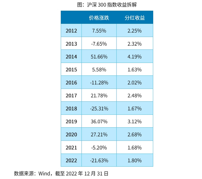 投资股市的收益来源于两个部分:一是股票价格涨跌,投资者买卖股票赚取的价差;二是公司分红为投资者提供的收益。以沪深300为例进行收益分解,不难发现价格涨跌波动非常高,而分红段每年可以稳定提供2%左右的收益。
