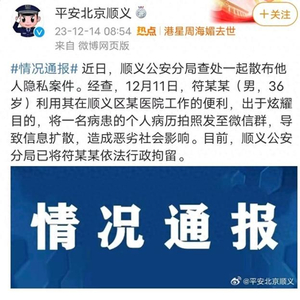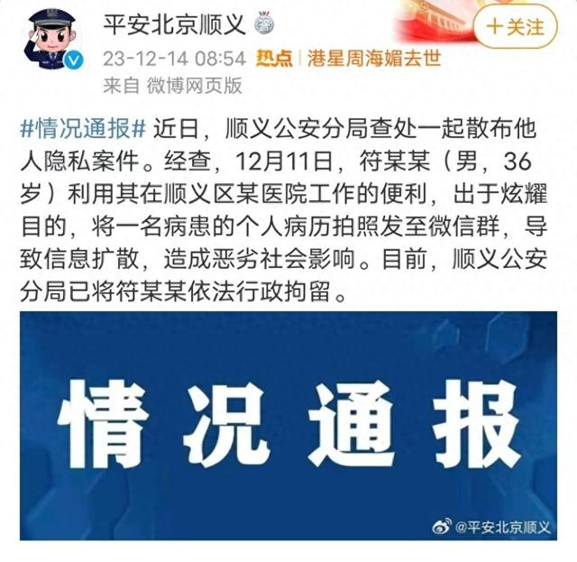 12月12日晚,著名演员周海媚离世的消息得到确认。同时,疑似周海媚生前送往医院抢救的电子病历在网上流传,上面含有周海媚个人资料、就诊时间等信息。12月14日,顺义公安分局发布通报称,符某某利用在医院工作的便利,出于炫耀的目的,将病患的个人病历拍照发至微信群,导致信息扩散,造成恶劣社会影响。目前,符某某已被依法行政拘留。