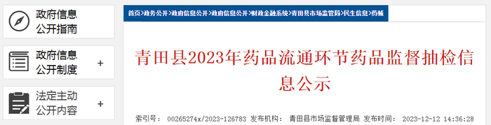 【浙江】青田县2023年药品流通环节药品监督抽检信息公示
