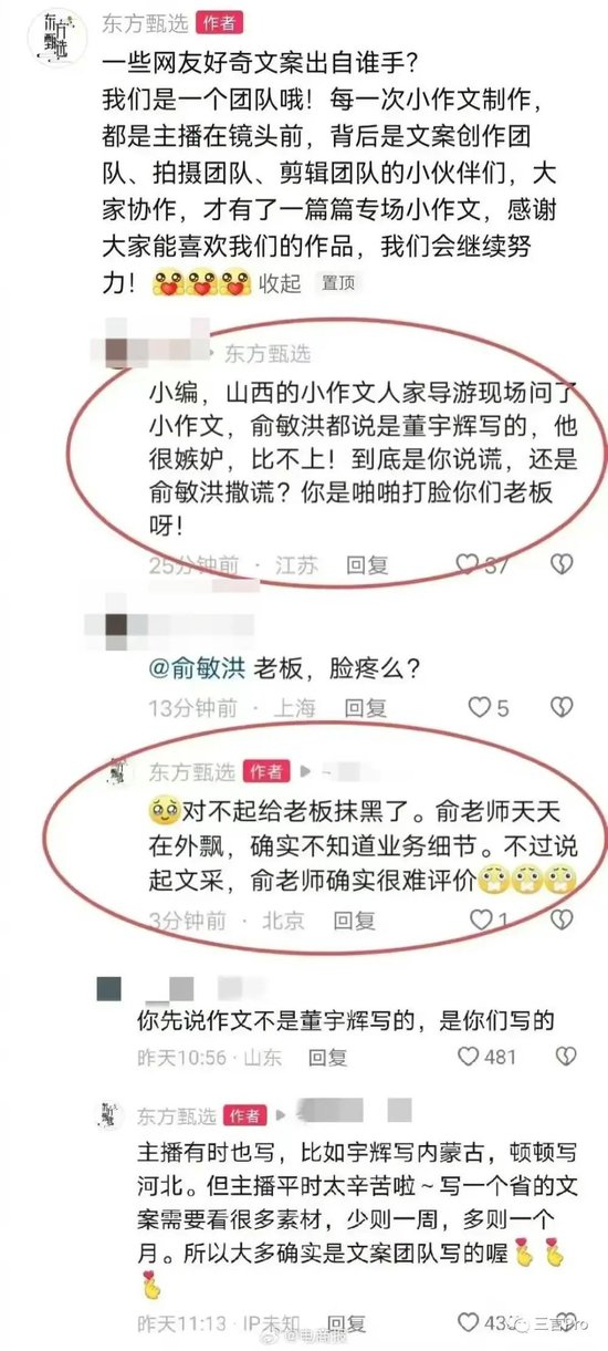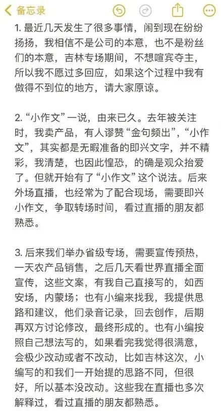董宇辉在回应中介绍了东方甄选的小作文创作模式:一是自己本人创作,如西安场,内蒙场;二是自己提供思路和建议,小编创作,双方讨论修改;三是小编自主创作,自己极少改动或不改动。