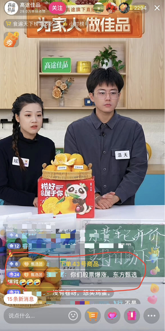 今日早间,证券时报记者查看高途佳品直播间,也不时看到一些头顶“甄选团”橙色灯牌的网友在直播间下单或者留言,更有一位网友留言称,“你们股票暴涨,东方甄选暴跌。”