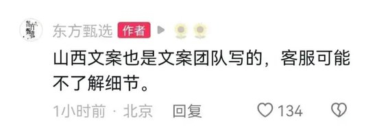 东方甄选的小编继续回应说“山西文案也是文案团队写的,客服可能不了解细节”。