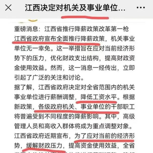这则标着“重磅消息”的贴文称:江西省推行降薪政策改革第一枪。江西省政府宣布全面推行降薪政策,机关事业单位无一幸免。这一举措旨在应对当前经济形势下的压力,优化财政支出结构,提高财政资金使用效益……根据新政策,各级政府机关、事业单位的干部职工将普遍受到不同程度的降薪影响。其中,高级管理人员和高收入群体将成为重点调整对象。
