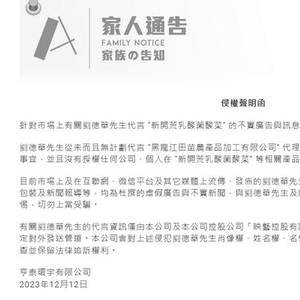刘德华经纪公司亨泰环宇有限公司在刘德华粉丝官网“华仔天地”声明函称,刘德华从未而且无计划代言“黑龙江田苗农产品加工有限公司”代理的“新开荒乳酸菌酸菜”等相关产品和服务事宜,并且没有授权任何公司和个人在“新开荒乳酸菌酸菜”等相关产品上使用刘德华本人的肖像及姓名。该公司会对上述侵犯刘德华肖像权、姓名权、名誉权、知识产权等民事权益的行为进行调查,并保留法律追诉权利。
