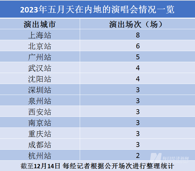 事实上,在歌迷内部,除了关于五月天疑似假唱的争议,还有一点是他们格外关注的:为何今年五月天今天的演唱会如此密集?公开数据显示,截至目前,2023年五月天在亚洲巡回演唱会高达73场,其中内地共演出47场,几乎周周开唱。仅11月上海就举办了8场,门票价格从355元—1855元。有业内人士向每经记者表示,粗略估计上海8场演出票房超3亿元。