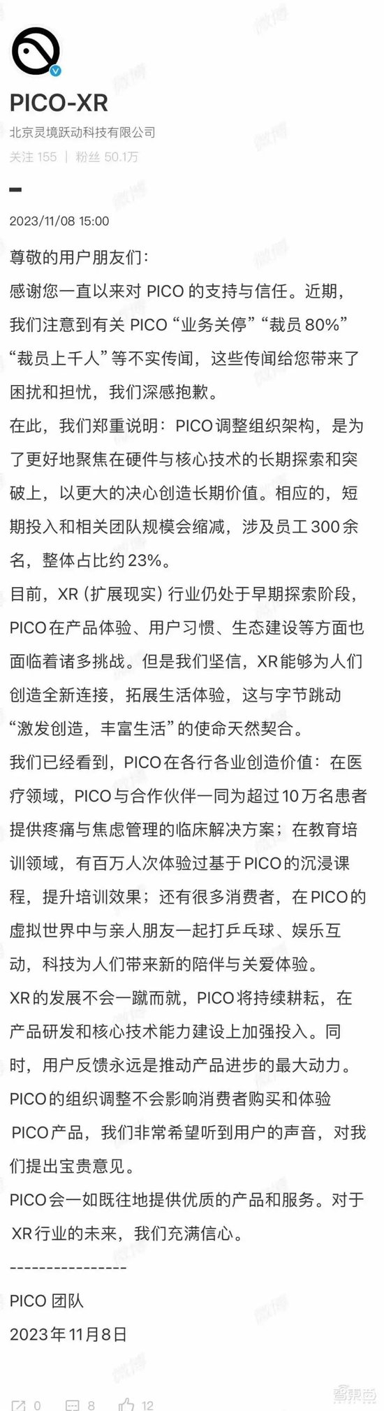 PICO官方在微博给出的回应,此次组织调整将涉及300余人,整体占比约为23%。但The Information对PICO大裁员风波后的信息给出进一步曝料,PICO本轮收缩,波及的范围或比计划的要更广一些。