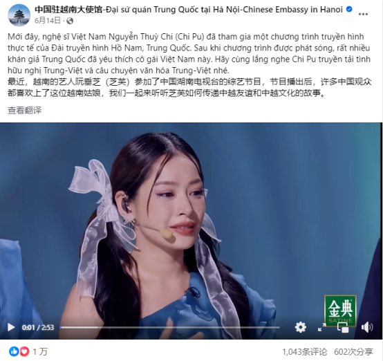 中国驻越南大使馆Facebook发文点赞越南艺人芝芙在《乘风2023》传播中越文化。