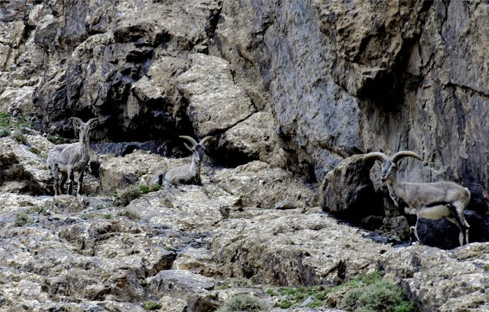 阿尔金山格库铁路建设工地附近山上的岩羊(2020年7月19日摄)。格库铁路在建设中,参与建设的施工方严格环境保护制度,阿尔金山野生动物的栖息地得到的效保护。陈剑飞摄