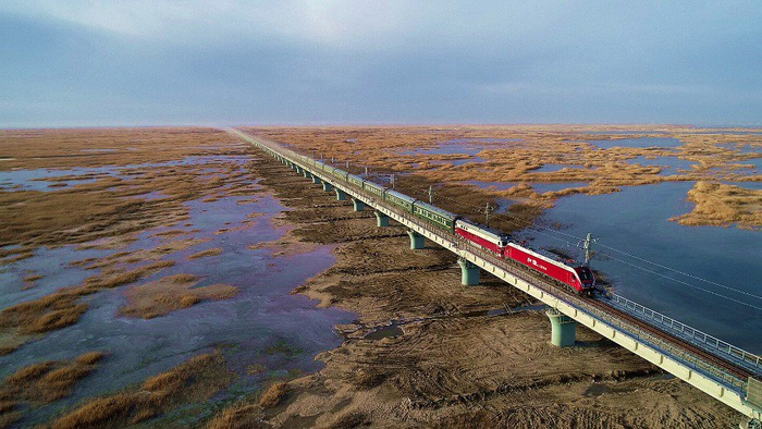 台特玛湖特大桥跨越塔里木河和台特玛湖,征服了沙漠、沼泽、湿地等复杂条件。同时为防路基风沙堆积而阻断水流,穿越湖区的铁路采用桥梁结构,以替代传统地面铁路铺装,造价更高,但大大降低了对生态环境的影响。