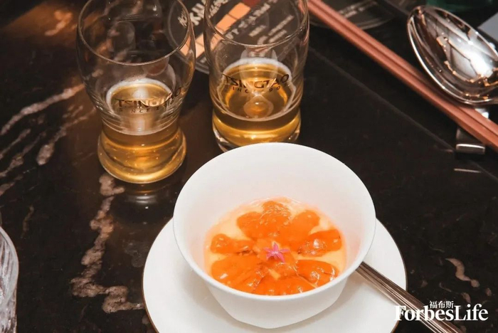 蟹螯即金液。螃蟹的鲜古来就被赞颂,在“苏轼醉蟹佐海胆秋茄冻”中,金璟阁团队用酒吊起螃蟹的鲜,一口下去便是蟹肥百余香。青岛原浆配上苏式的醉蟹,佐上一份海胆秋茄冻,也可乘月醉高台。今人食蟹也如古人,莫“堪笑吴兴馋太守”,今人不也同样沉醉。