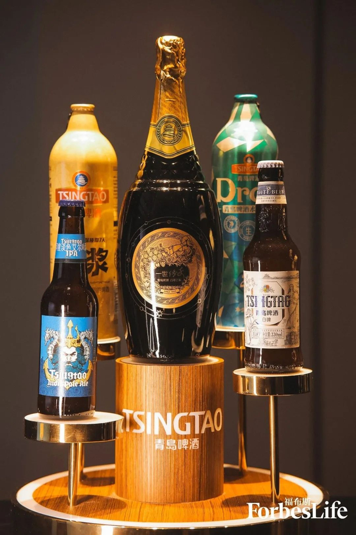 从左至右:青岛啤酒 IPA、原浆、“一世传奇”、水晶纯生、白啤