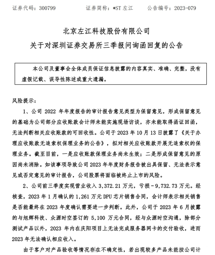 在回复公告中,*ST左江表示,由于客户对产品验收等情况存在不确定性,若出现较多产品未能按公司计划交付、公司2023年亏损且营业收入低于1亿元的情况,公司股票将存在终止上市交易的风险。
