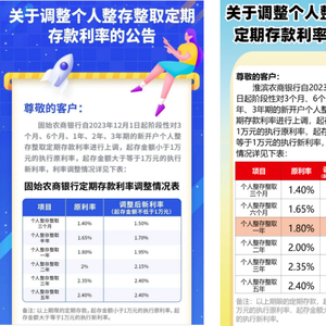 淮滨农商银行宣布,自12月12日起阶段性上调新开户个人整存整取定期存款利率。起存金额小于1万元的执行原利率,起存金额大于等于1万元的执行上调后利率。