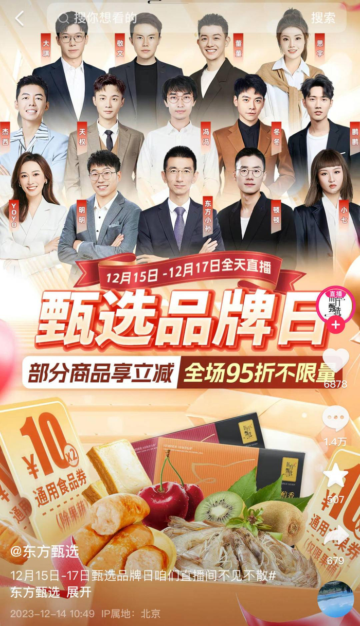 值得注意的是,12月14日,东方甄选发布甄选品牌日15日至17日全天直播宣传海报,董宇辉未在其中。