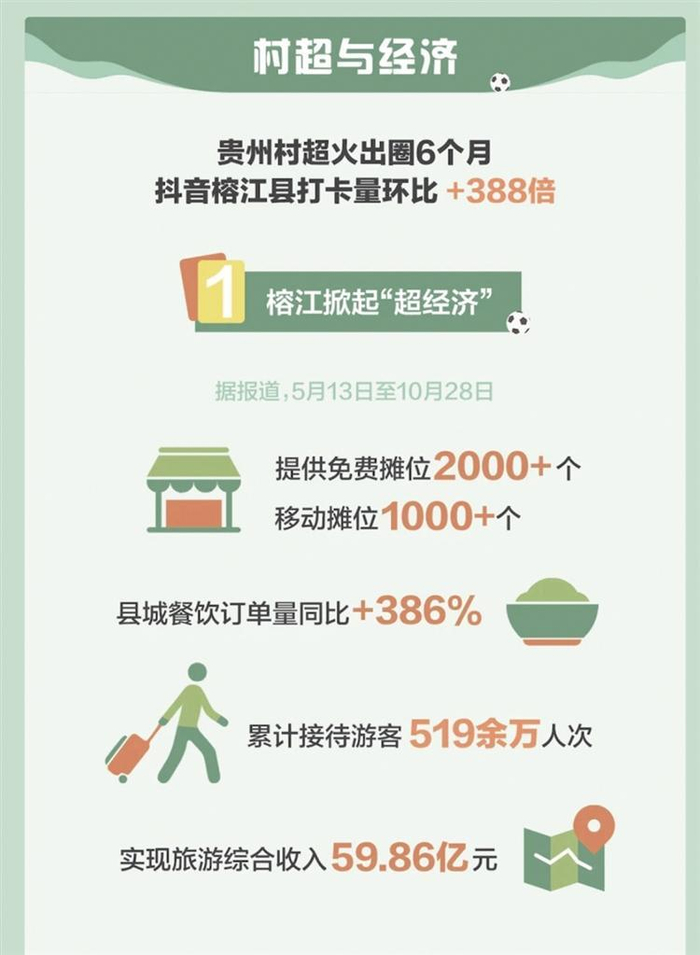 据11月15日抖音生活服务发布的《贵州村超大数据》显示,今年5月至10月,“村超”相关话题在抖音站内播放超130亿次,相关直播超3亿人次观看。榕江县在抖音生活服务平台的订单同比增长超3倍,其中旅游订单同比增160多倍。贵州“村超”,带动当地文旅综合收入近60亿元,线上线下各项数据屡创新高。