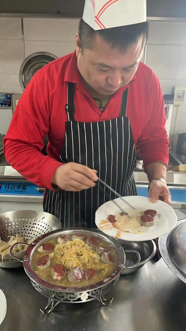 杀猪菜,原本是东北农村每年接近年关时所吃的一道炖菜,现在已经是东北菜的代表。白肉是带皮的大片儿五花肉;血肠要用新鲜的猪血,加入葱花、盐等调味后灌制而成;酸菜也是有讲究的,用东北大白菜靠自然发酵变酸腌成。“这三样汇入一锅,炖得越久就越是香浓,在传统的杀猪菜基础上,为了更便于人们出行食用,还会采用酒精块在小锅底部加热来保证杀猪菜的口感。”主厨董术波说,午饭时分,这里几乎每桌都有一道杀猪菜,让司乘人员吃得津津有味。
